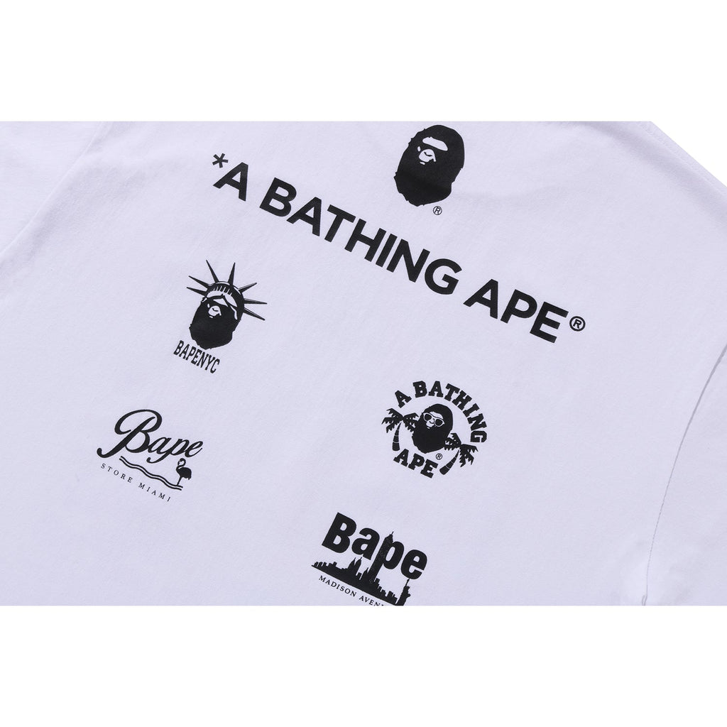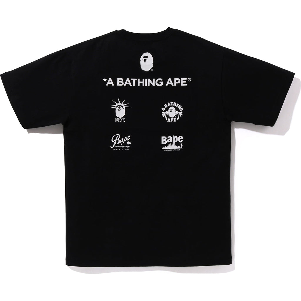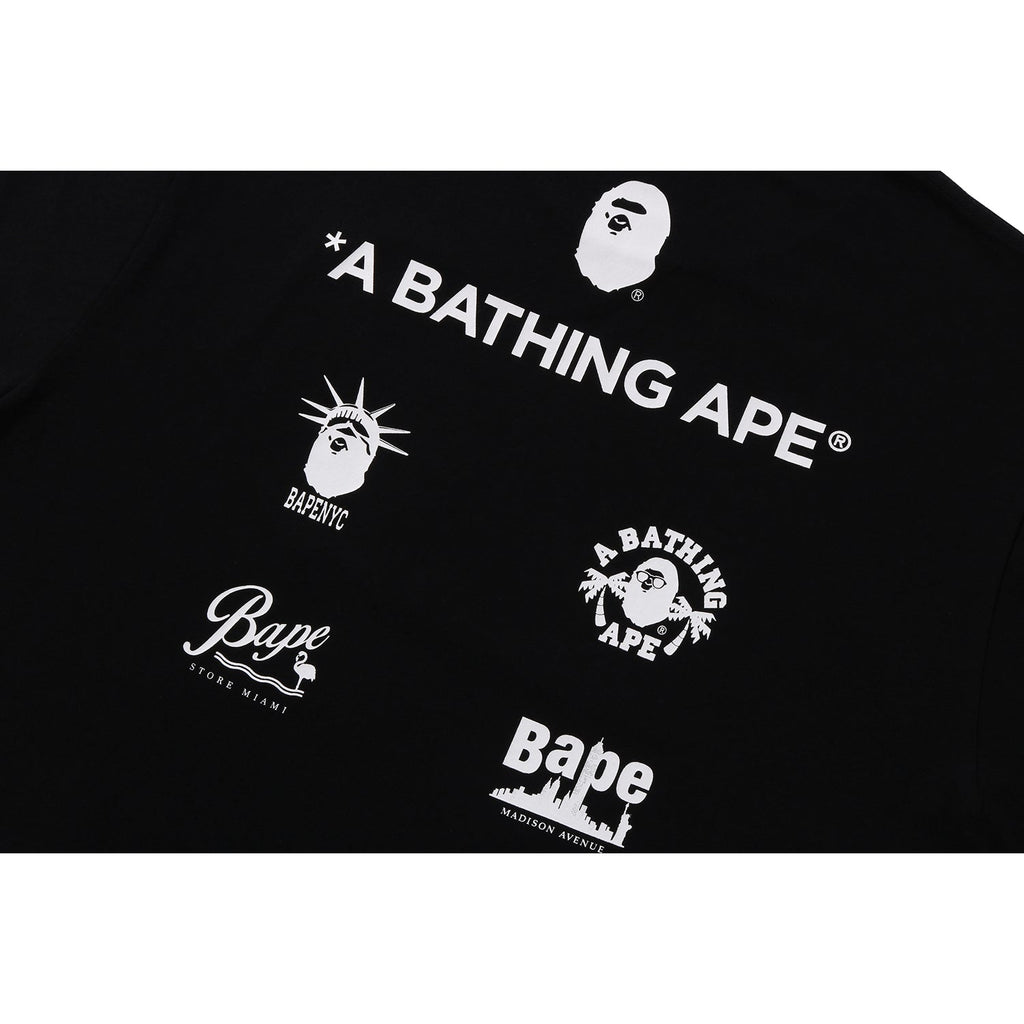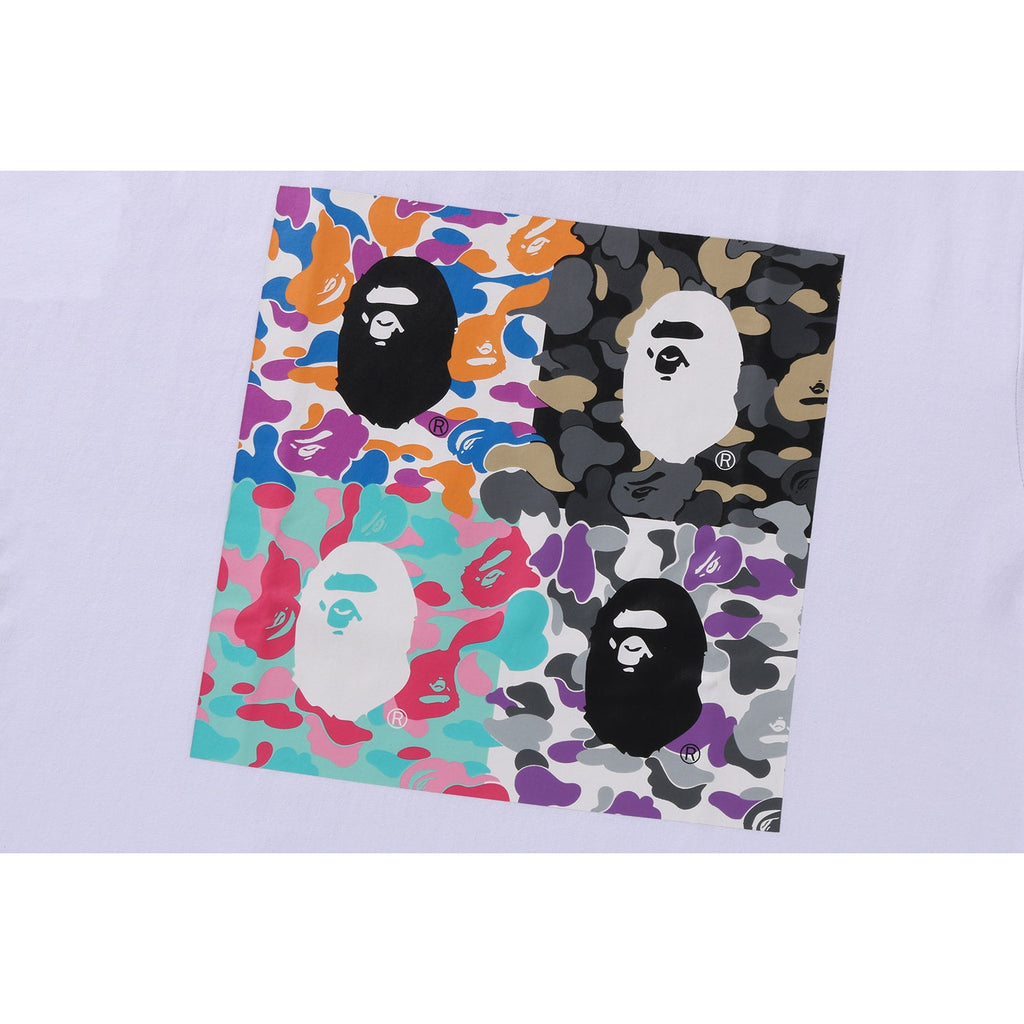 This BAPE men's cotton T-shirt from the US Limited Collection showcases four rubber-printed ape head logos in various camo colors. The back displays the BAPE US locations logos, combining unique style with comfort for everyday wear.
